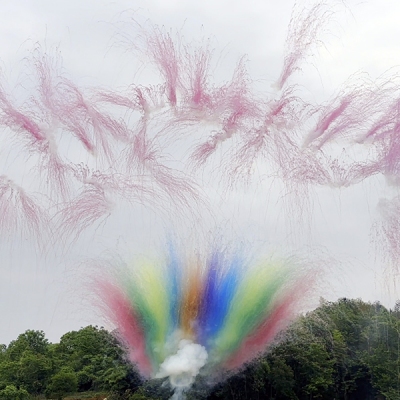 2. Внизу разноцветная веерная мина с мелким треском, а наверху конские хвосты из розового дыма.