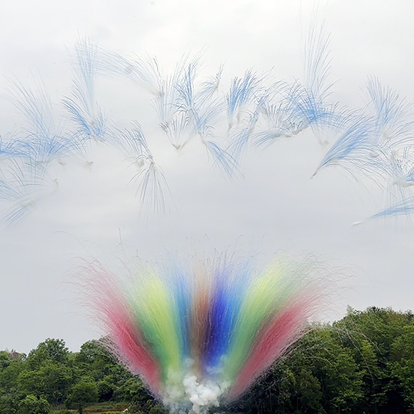 2. Внизу разноцветная веерная мина с мелким треском, а наверху конские хвосты из синего дыма.